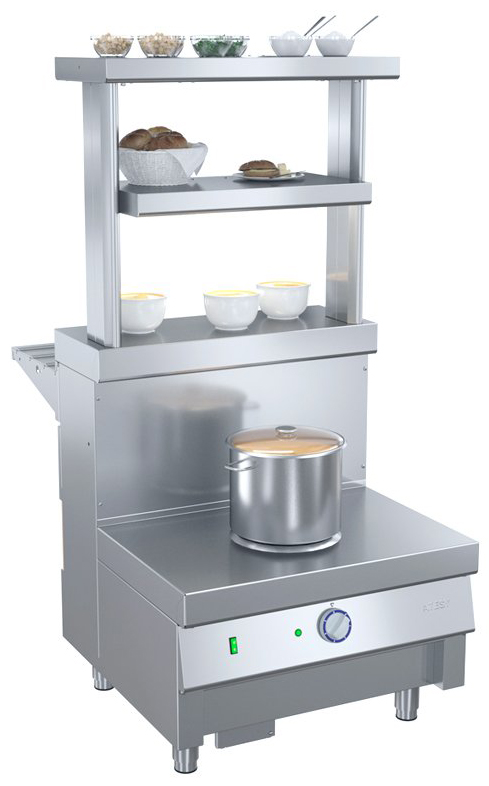 Мармит ATESY Ривьера М1-1.700-02-О используется на предприятиях общественного питания и торговли для поддержания в горячем состоянии наплитной посуды с первыми блюдами. Модель оснащена 1 круглой конфоркой и 6-позиционным пакетным переключателем, позволяющим регулировать ее температуру. Столешница выполнена из нержавеющей стали AISI 430, ножки - из нержавеющей стали и пластиковой опорной части.