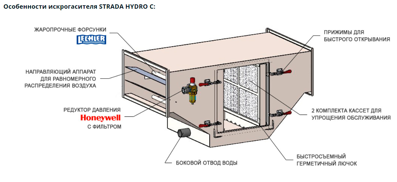 Искрогаситель STRADA HYDRO C 8,0 предназначен для гашения искр пламени от мангалов, грилей и угольных печей на предприятиях общественного питания и торговли. Модель оснащена 6 жаропрочными форсунками с улучшенными характеристиками для максимального гашения искр, многослойной сетчатой кассетой из гофрированных нержавеющих сеток разного диаметра, съемной каплеулавливающей кассетой и быстросъемным герметичным люком. Корпус выполнен из нержавеющей стали AISI 430, фильтрующие кассеты - из жаропрочных коррозионностойких материалов.