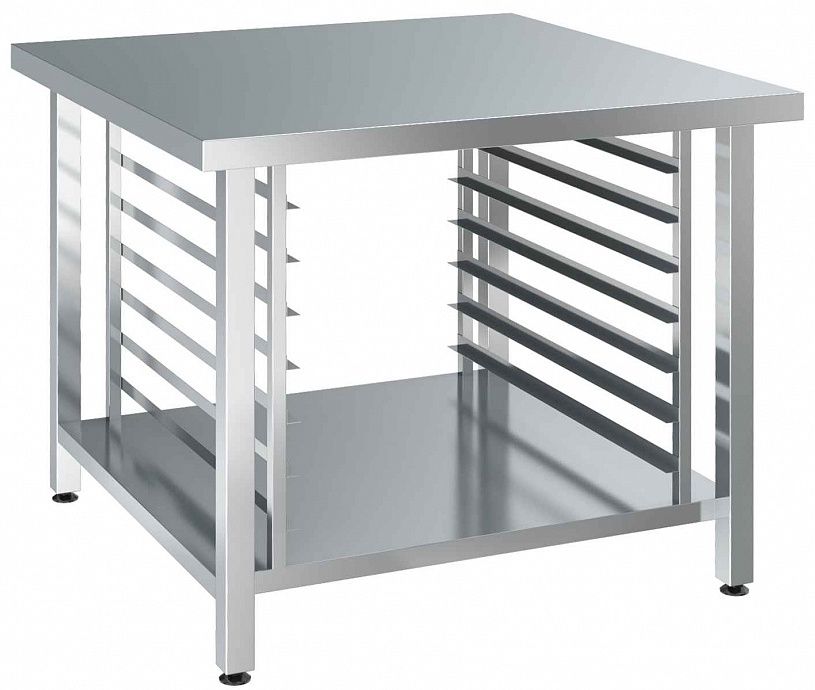 Подставка для пароконвектомата КАМИК Пд-П-315575 используется совместно с пароконвектоматом UNOX серии XECC на предприятиях общественного питания и торговли. Столешница выполнена из нержавещей стали AISI 430. Сварной каркас из нержавеющей стали AISI 430 (профиль труба 40х40 мм). Подставка имеет 4 уровня направляющих под гастроемкости GN 2/3.