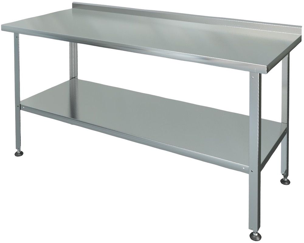 Столешница стола, усиленная подложкой из ЛДСП толщиной 15 мм,выполнена из нержавеющей стали AISI 430 толщиной 0,5 мм, каркас - из оцинкованного уголка толщиной 1+1 мм, ножки с регулиремыми опорами - из оцинкованного стального уголка 40х40 мм с подгибом краёв во внутрь толщиной 1,0 мм. Изделие оснащено практичной сплошной полкой из нержавеющей стали и одним бортом.