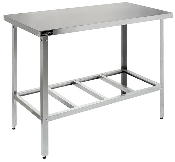 Столешница стола Kобор СР-100/60 произведена из высококачественной нержавеющей стали, а также для увеличения прочности и во избежании прогибания укреплена ламинированной древесно-стружечной плитой толщиной 16 мм. Ножки стола регулируются по высоте, что помогает избежать наклона рабочей поверхности стола. Каркас стола выполнен из оцинкованного уголка. Товар поставляется в разобранном виде и в упаковке для облегчения транспортировки.