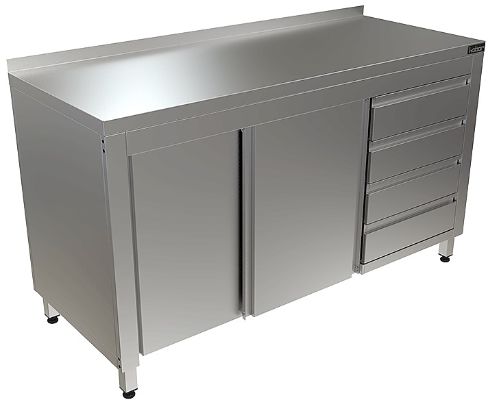Стол производственный Кобор СТБ/1-150/70/К используется на предприятиях общественного питания, торговли и пищевых производствах для хранения кухонной утвари и обработки различных ингредиентов перед приготовлением. Материал каркаса - высококачественная нержавеющая сталь (труба 40х40 мм), материал столешницы - высококачественная нержавеющая сталь AISI 430, усиленная листом ЛДСП (толщина 16 мм).