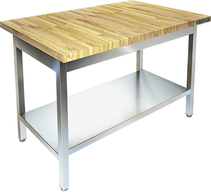 Кондитерский стол Техно-ТТ СП-323/1808 предназначен для раскатки теста и обработки ингредиентов для приготовления кондитерских и хлебобулочных изделий, а также для расстановки и хранения посуды и кухонного инвентаря на предприятиях общественного питания, торговли и пищевых производствах. Модель оснащена регулируемыми по высоте ножками, что позволяет компенсировать неровности пола. Материал разборного каркаса - труба (40x40 мм) из нержавеющей стали AISI 304, материал сплошной полки - нержавеющая сталь AISI 430, материал столешницы - бук.