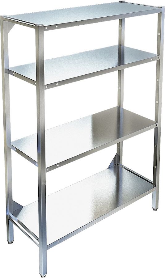Кухонный стеллаж Техно-ТТ СТР-154/804 используется на предприятиях общественного питания, торговли и пищевых производствах для хранения посуды, кухонного инвентаря и продуктов. В модели предусмотрены регулируемые ножки и полки. Тип каркаса - разборный, полки - сплошные. Материал каркаса - нержавеющая сталь AISI 430 (труба 40х20 мм толщиной 1,2 мм), материал полок - нержавеющая сталь AISI 304 (толщина 0.8 мм).