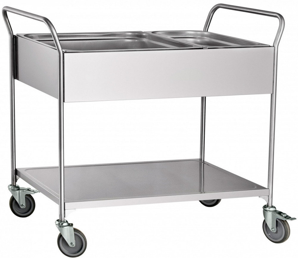 Тележка для сбора посуды Abat ТС-100 предназначена для транспортировки использованных тарелок,  стаканов, столовых приборов и инвентаря на предприятиях общественного питания и торговли. Модель оснащена 2 фиксированными и 2 поворотными колесами.