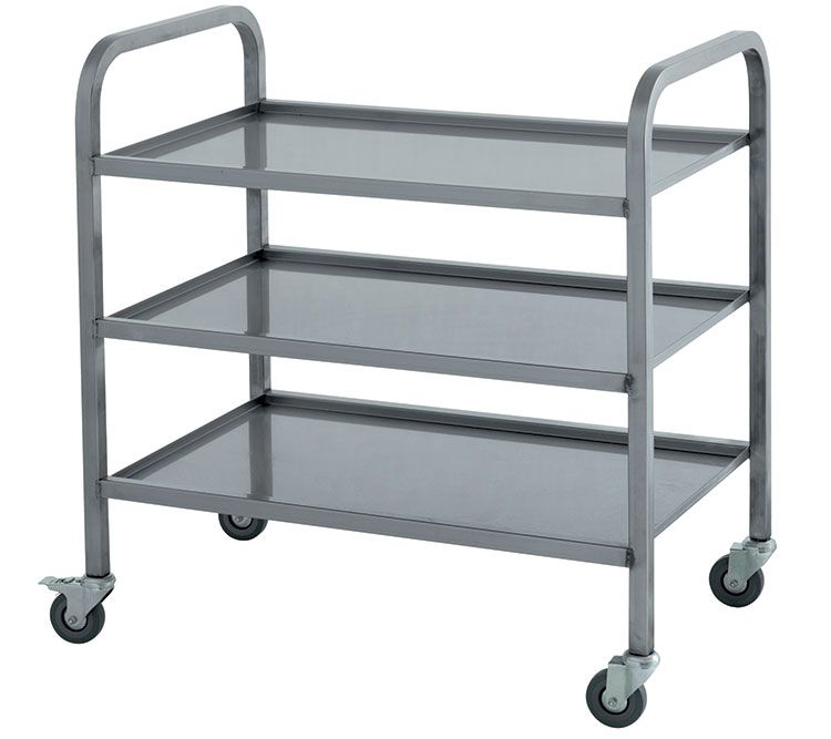 Сервировочная тележка ATESY ТС-Л-3-850.530.900-02 серии Люкс используется на предприятиях общественного питания для перемещения готовых блюд, напитков и посуды в зал приема пищи, а также для подачи грязной посуды из зала в моечное отделение. Модель оснащена 3 вместительными полками с герметичными бортиками. Полки выполнены из нержавеющей стали AISI 304, рамы - из нержавеющей трубы AISI 304 сечением 25х25 мм.