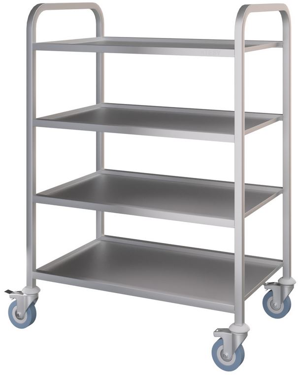 Тележка ATESY ТС-Л-4-800.500.1100-02 серии Люкс используется на предприятиях общественного питания, торговли и пищевых производствах для перемещения в зал готовых блюд, напитков и посуды, а также для сбора грязной посуды. Модель оснащена бортиком по периметру и колесами. Материал полок и стоек - высококачественная нержавеющая сталь AISI 304.