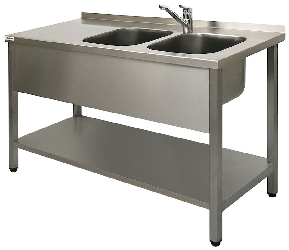 Ванна моечная двойная Simeco ВМ2EП1406П используется на предприятиях общественного питания и торговли для мытья и ополаскивания продуктов, посуды и различного инвентаря. Модель оснащена фартуком, нижней сплошной полкой, задним бортиком 40 мм и регулируемыми по высоте ножками, что позволяет компенсировать неровности пола. Сварной каркас выполнен из трубы 40х40 мм, мойки цельнотянутые - из нержавеющей стали AISI 304 толщиной 1 мм, выпуск - из нержавеющей стали.