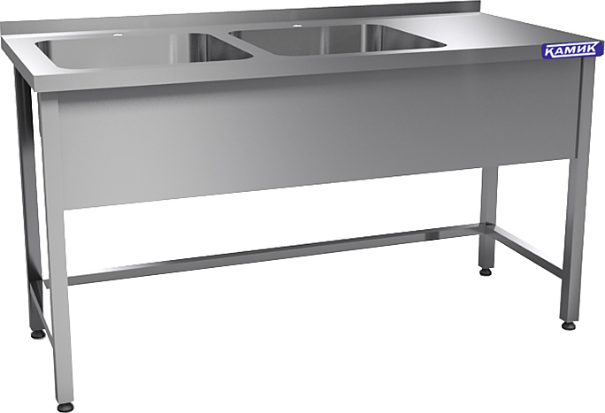 Моечная ванна КАМИК ВМ-2-42166 используется на предприятиях общественного питания и торговли для мойки посуды, овощей и фруктов. Сварной каркас и столешница выполнены из нержавеющей стали AISI 430, цельнотянутая емкость - из нержавеющей стали AISI 304.