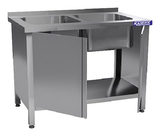 Моечная ванна КАМИК ВМ-2-431370 используется на предприятиях общественного питания и торговли для мойки посуды, овощей и фруктов. Сварной каркас выполнен из нержавеющей стали AISI 430 толщиной 1 мм, столешница и цельнотянутая емкость - из нержавеющей стали AISI 304 толщиной 1,5 мм.