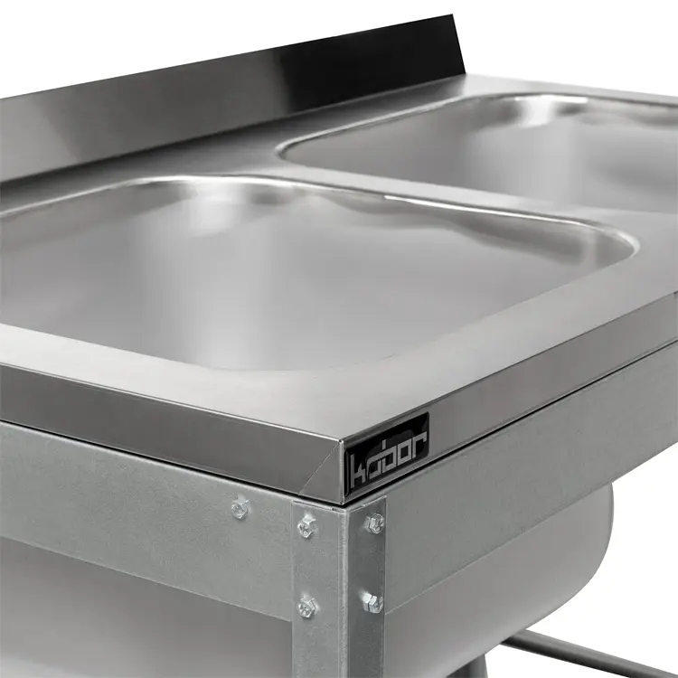 Емкость ванны Кобор ВМЦ/2-140/70 выполнена из высококачественной пищевой нержавеющей стали, имеет подогнутую кромку для предотвращения травмирования рабочего персонала. Ножки изготовлены в виде уголка 40х40 мм из оцинкованной стали и регулируются по высоте, что помогает избежать наклона рабочей поверхности. Во избежание попадания воды и грязи у ванной имеется борт высотой 70 мм.