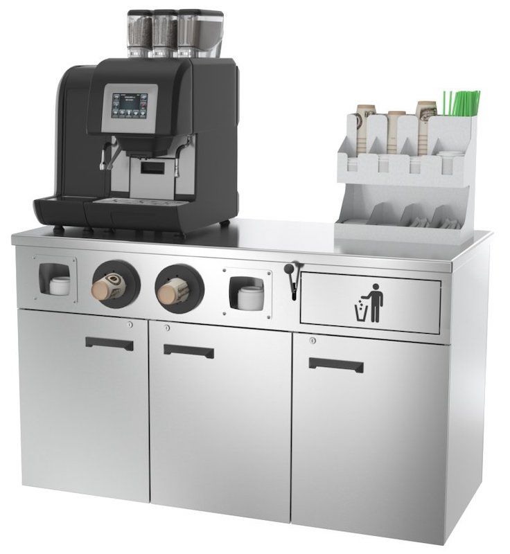 • Просторный шкаф с распашными дверцами для хранения воды, посуды, кофе и ингредиентов