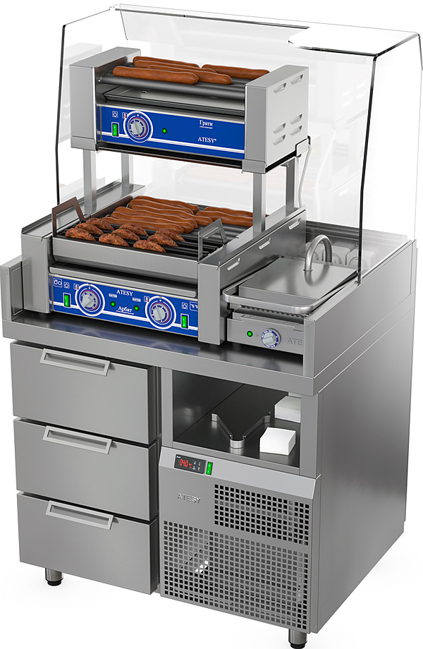 Станция для бургеров и хот-догов ATESY Бавария БХС-900.700-02 плюс используется на предприятиях общественного питания, торговли и пищевых для производствах с целью комплексного оснащения места для приготовления и продажи хот-догов и бургеров, а также хранения охлажденных полуфабрикатов, начинок, соусов и хлебобулочных изделий. Нейтральная ниша для хранения инвентаря и посуды, охлаждаемые гастронормированные ящики (GN 1/1, максимально допустимая глубина устанавливаемых гастроемкостей - 150 мм), температурный режим станции регулируется с помощью встроенного контроллера (есть возможность программирования). Рабочее пространство столешницы предусматривает установку комби-гриля “АРБАТ” КГ-7, гриля контактного “МАЭСТРО” ГК-1, роликового гриля "ГРАТИ-5" (поставляются отдельно). Материал станции - нержавеющая сталь.