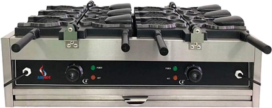 Вафельница Airhot WBFT-6 тайяки предназначается для выпекания вафель в форме рыбок (с местом под начинку) на предприятиях общественного питания, торговли и пищевых производствах. Электронный таймер и терморегулятор. Материал корпуса - нержавеющая сталь, материал жарочной поверхности - чугун с антипригарным покрытием.