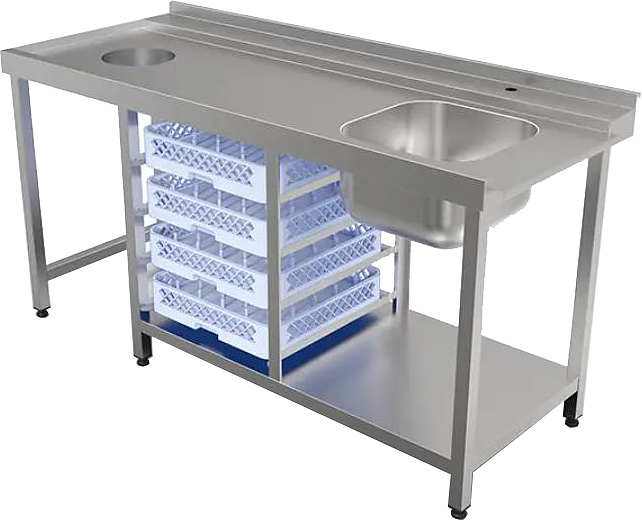 Входной стол Кобор СПМ/1-170/70/П используется на предприятиях общественного питания, торговли, в гостиничном бизнесе и других сферах для комплектации барных стоек и размещения посудомоечной машины. Стол оснащен отверстием под смеситель, отверстием для сбора отходов, полкой, 4 уровнями направляющих для посудомоечных кассет и бортом. Материал каркаса - труба из нержавеющей стали (40x40 мм), материал столешницы - нержавеющая сталь AISI 430.