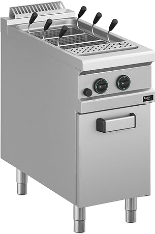 Макароноварка Apach APPG-49P/PL 900-й серии используется на предприятиях общественного питания и торговли для приготовления спагетти, пасты и прочих изделий из теста. Модель оснащена закрытым шкафом с распашной дверцей, электромеханической панелью управления с терморегулятором и таймером и горелками с пьезоэлектрическим поджигом и системой стабилизации пламени. Корпус, рабочая поверхность, панель управления и вытяжная решетка выполнены из нержавеющей стали AISI 304, дверца, боковые и задние панели - из нержавеющей стали AISI 430, ванна - из нержавеющей стали AISI 316.