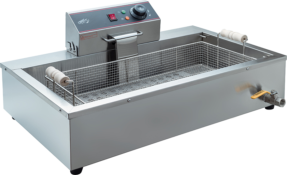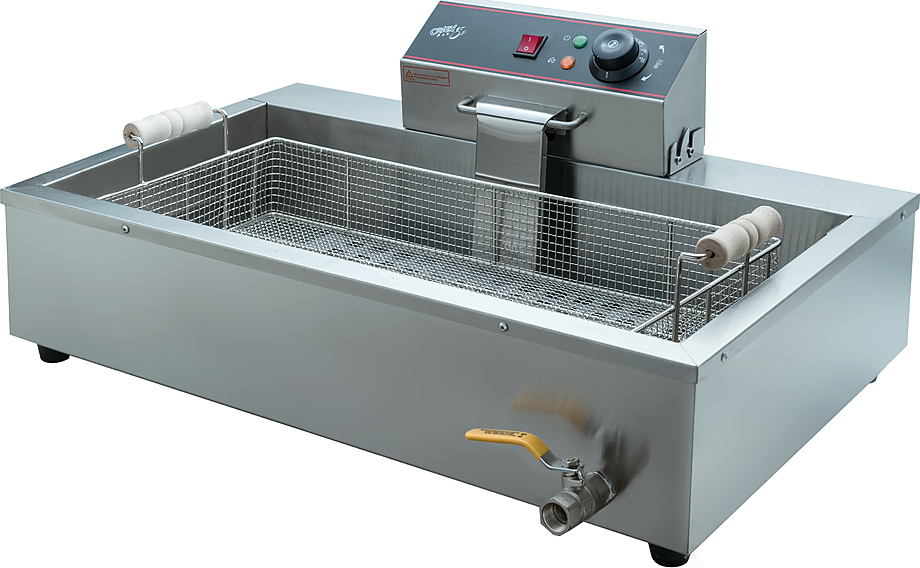 Чебуречница Crazy Pan CP-BEF16 предназначена для приготовления различных продуктов в большом количестве масла на предприятиях общественного питания и торговли. Модель оснащена терморегулятором, боковым поддоном, объемной съемной корзиной и шипцами. Корпус выполнен из нержавеющей стали.