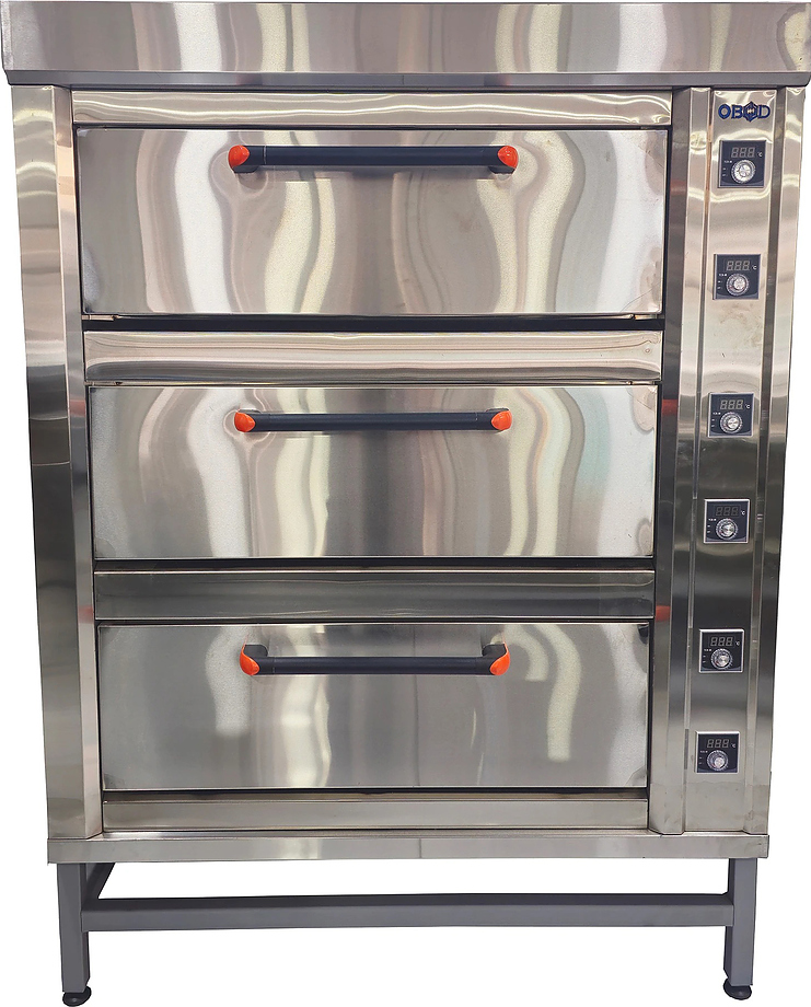 Духовой шкаф OBOD/3 уровня предназначена для приготовления различных блюд и выпечки хлебобулочных и кондитерских изделий на предприятиях общественного питания, торговли и пищевых производствах. Модель оборудована электромеханическим управлением, регулировкой температуры, 2 термостатами для каждой камеры, жаропрочным стеклом и внутренней подсветкой. Материал подов - углеродистая сталь толщиной 3 мм, материал дверц - высококачественная нержавеющая сталь, материал ТЭН - нержавеющая сталь AISI 304.